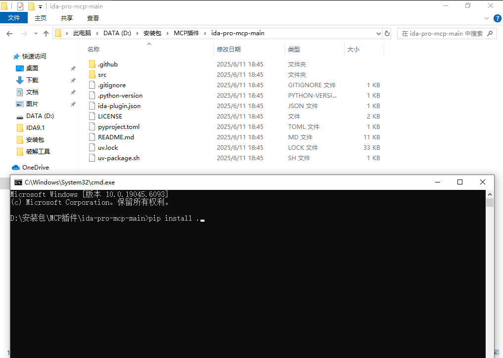 7.使用之前地址栏打开cmd的方法,打开如下的MCP安装包目录,并运行"pip install .",如果你设置过上面的pip默认源,安装会快一点。