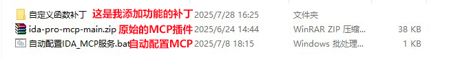 2.进入文件夹后,可以看到如下的3个项目,其中ida-pro-mcp-main.zip是原始的mcp插件(github的网址:https://github.com/mrexodia/ida-pro-mcp),"自定义函数补丁"文件夹的内容下面已说明,最后的"自动配置IDA_MCP服务.bat"每次开启IDA的MCP插件都运行下,这个批处理可以把虚拟机的mcp端口,自动端口映射到宿主机上的vscode里的cline远程调用,当然如果你会变通,也可以把一台电脑安装虚拟机,里面部署IDA和MCP服务器,然后把虚拟机的端口映射到宿主机上,设置下防火墙,用局域网下的另一台电脑来访问这个映射端口,以便远程调用IDA的MCP服务,安装了虚拟机的电脑相当于一个MCP服务器,局域网的另一台安装vscode的电脑相当于客户端,详细的配置批处理和虚拟机端口映射的方法,请看后文。