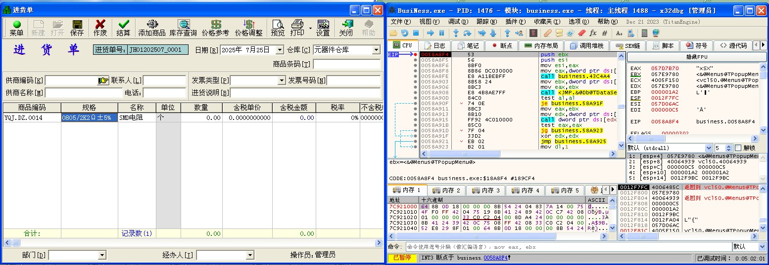 19.根据IDA和X64dbg的联合调试发现,上面这个函数_TFrm_Jinh_Jinhuo_PopupMenu_Dbgrid_mxPopup(地址:0x58a8f4),就是右键菜单的地址,可以看到下面的0x58a8f4处,我们右击时中断触发了。