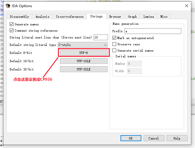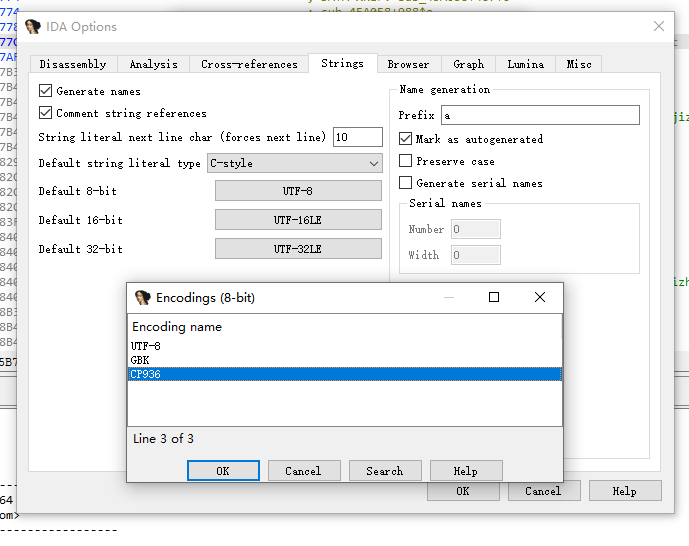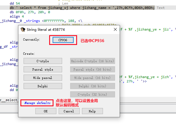 10.点击Manage defaults后,会弹出IDA Options-Strings字符串设置,然后把图中的Default 8-bit中的"UTF-8"设置成"CP936"。