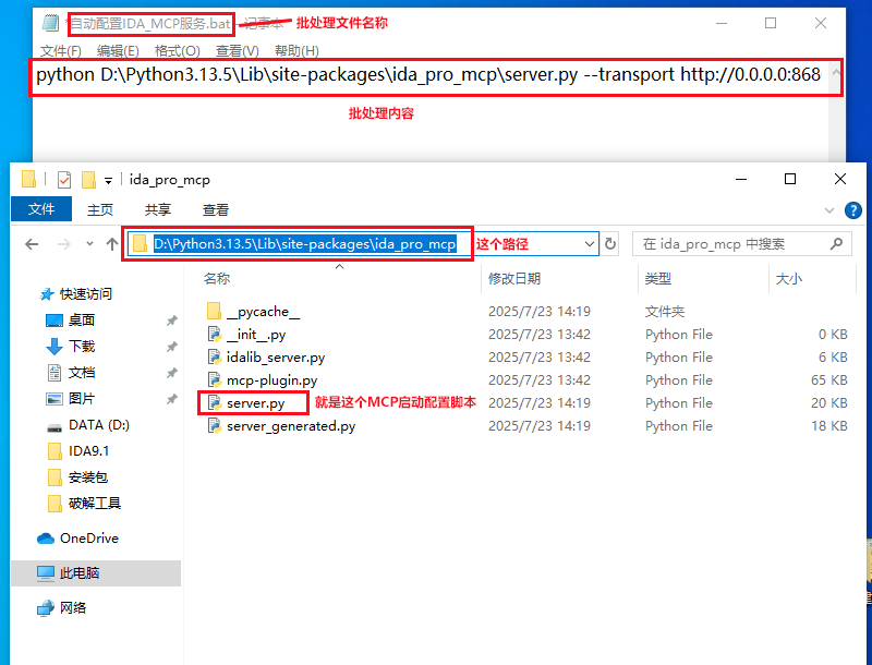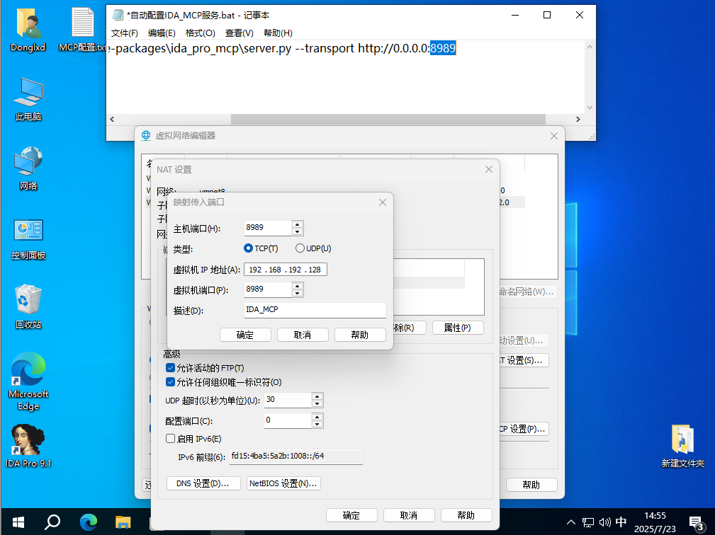 11. 如上的"server.py"其实是一个可以输入参数的配置mcp服务脚本,仔细阅读github的说明和源代码后,发现有两个参数,一个是--ida-rpc参数,这个参数会建立一个本地MCP服务端,比如"--ida-rpc http://127.0.0.1:13337"这样,另一个参数是--transport,调用方法:"--transport http://0.0.0.0:8989",这个参数的作用是开启一个广播mcp的本地端口,而我们需要使用的就是这个参数,我把这个参数编写成了一个批处理程序,每次需要宿主机调用虚拟机的mcp服务器时,运行就行,同时这个批处理运行后,会有一个cmd窗口一直开着,相当于一个web服务器,宿主机发送的所有外部的mcp请求,都会显示在这个cmd窗口中。最后记得ida中的mcp插件也启动一下。