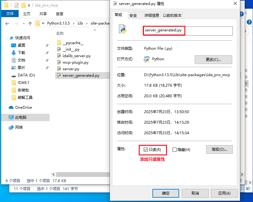 可以看到,我把"server_generated.py"添加了只读属性,这样其他代码如果对"server_generated.py"进行写入操作,那么就会激活Python的写入权限被拒绝的报错信息,如下: