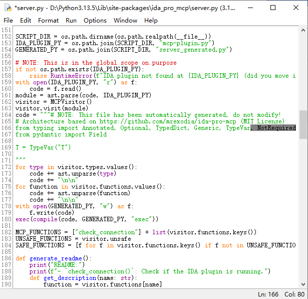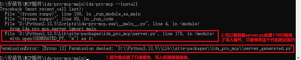 10.根据MCP的github的官网安装说明,在pip安装后,还需手动运行下"ida-pro-mcp --install"的MCP服务器配置命令,但是我在尝试运行时,提示错误"No module named 'NotRequired'"这样的错误,我当时没有截图,报错位置是"D:Python3.13.5Libsite-packagesida_pro_mcpserver_generated.py",具体信息如下: