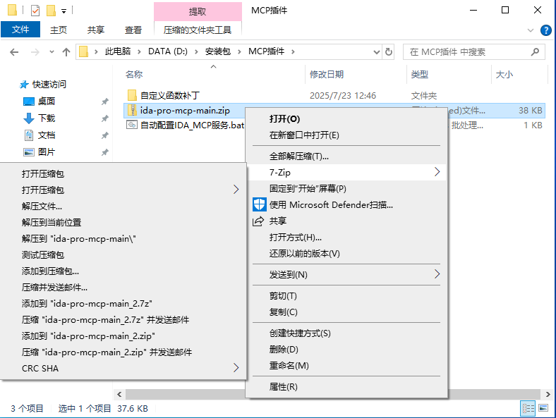 5.先把原版的MCP安装包解压"ida-pro-mcp-main.zip",这里可以用Winrar或者我提供的7-zip。