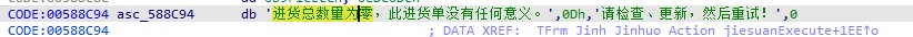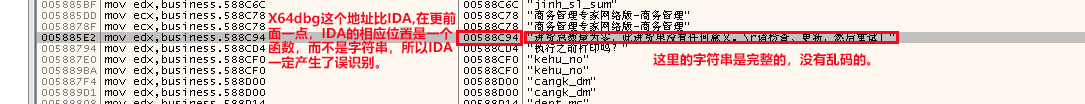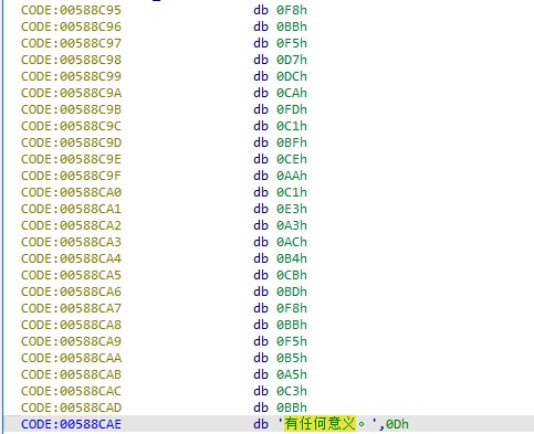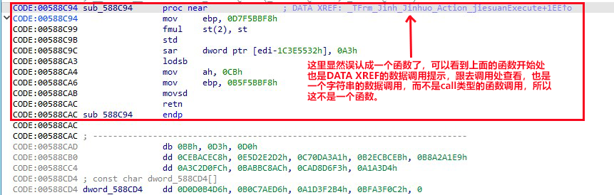 可以看到如下的IDA的00588C94位置被误认成一个函数,点击查看蓝色的DATA XREF调用处,也发现这是一个字符串调用,而不是一个函数的call调用,而这些误认的函数,就是导致乱码不能识别字符串的原因。
