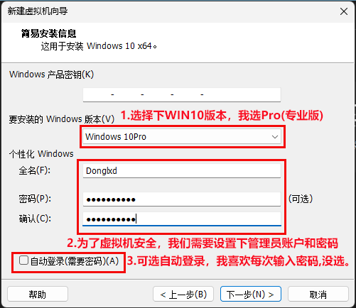 4.选择下WIN10版本,我选择了Pro(专业版),这样的话功能比较多,比如有组策略等安全控制;然后下面可以设置下管理员的账户和密码,最下面可以勾选自动登录,这样开机不用输入密码,我喜欢手动登录,所以没选,最后点击下一步: