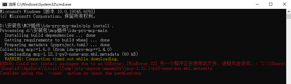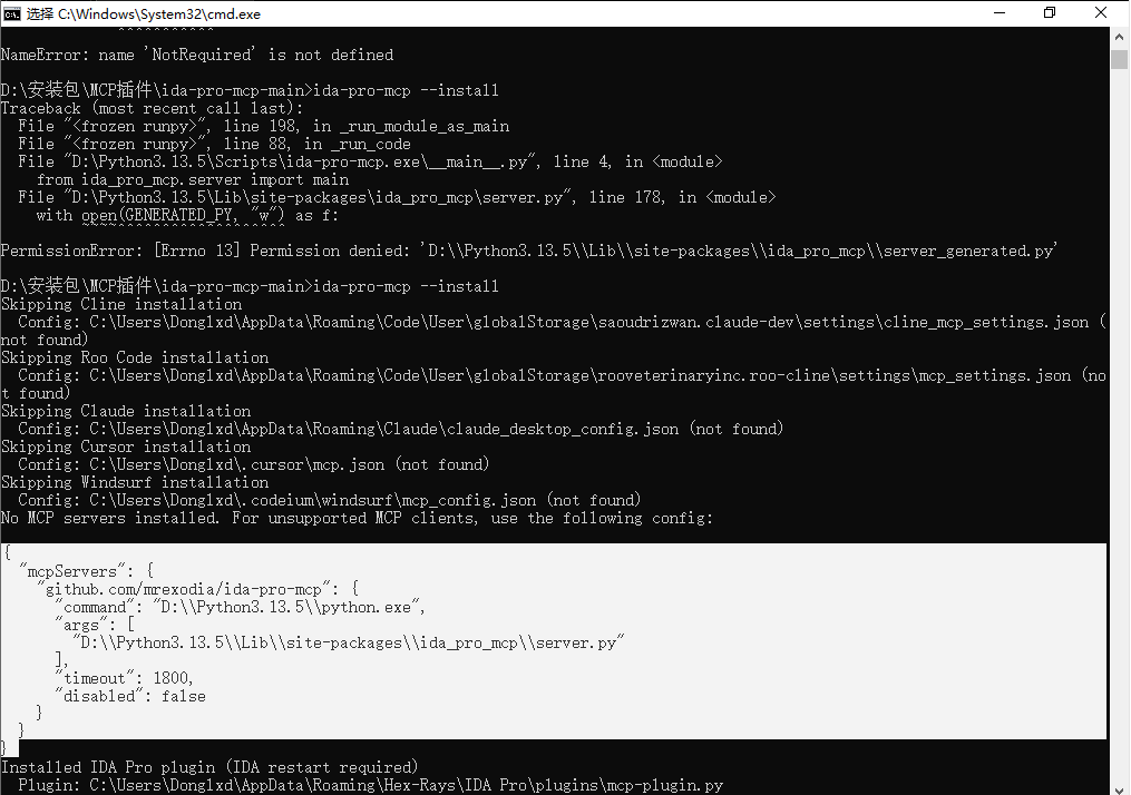 D:安装包MCP插件ida-pro-mcp-main>ida-pro-mcp --install