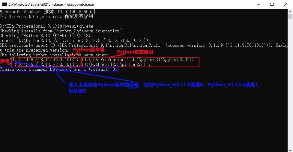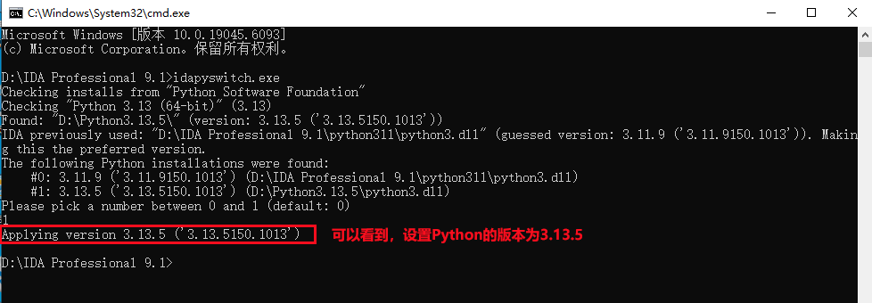 7. 可以看到如下例子,其中找到了两个python,版本分别是3.11.9(东方大佬IDA安装包中自带Python版本)和3.13.5(我之前安装的最新版Python),输入对应需要就行,这里我输入1,然后回车。