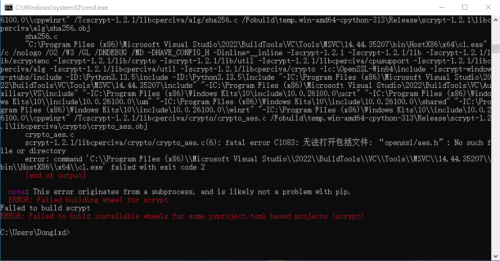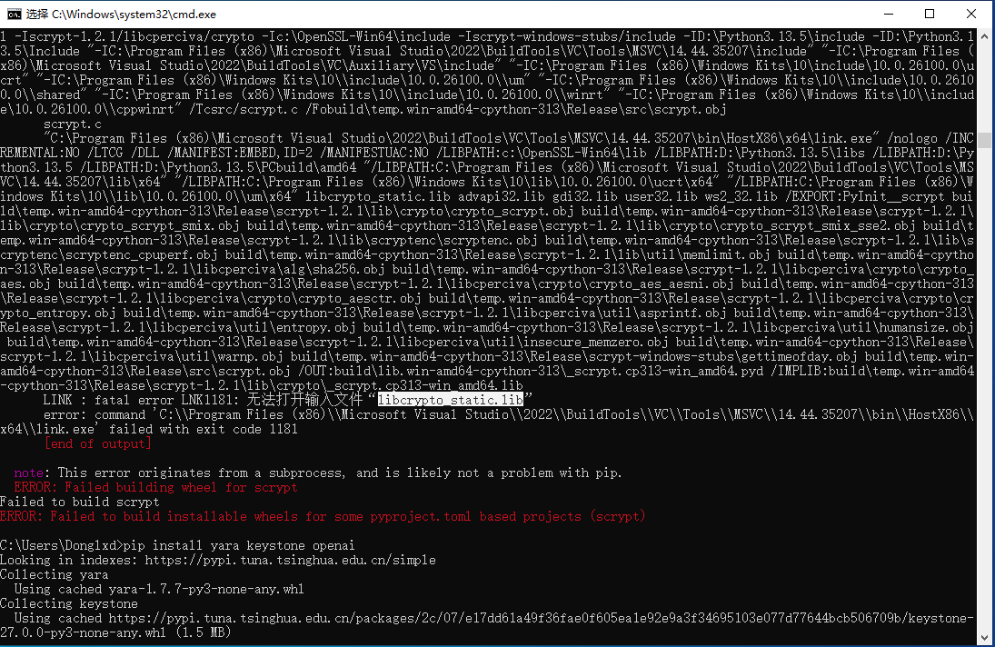 重新运行刚刚的"pip install yara keystone openai"命令,继续安装,报错如下:
