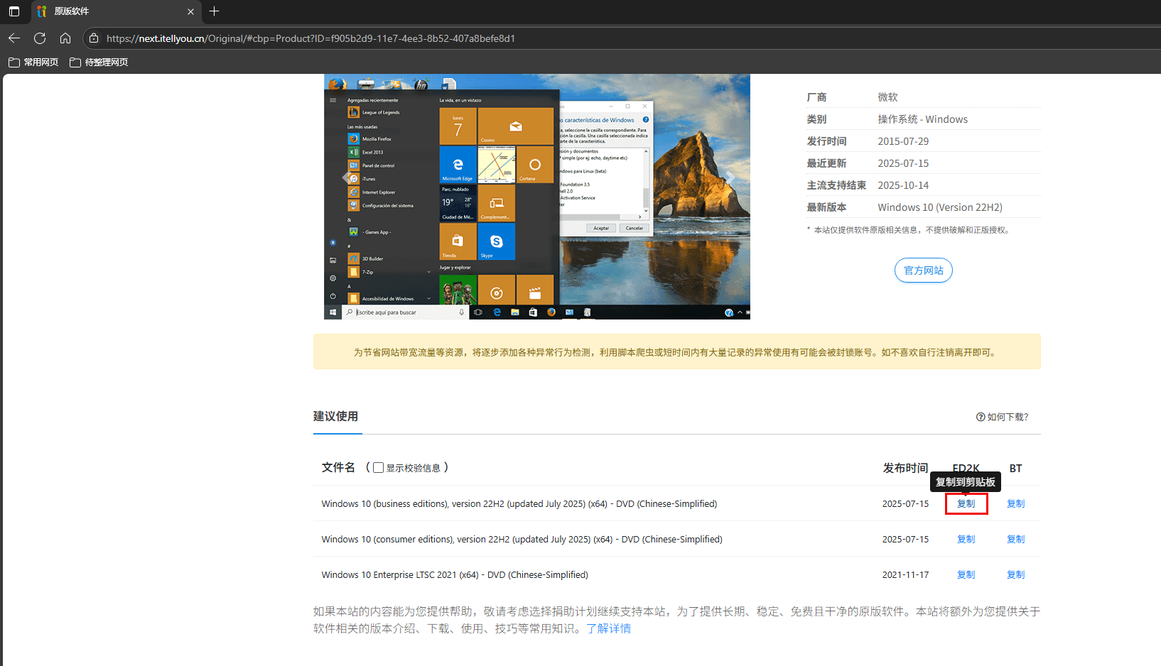 然后就是解决Window 10镜像的问题,可以到著名的Itellyou网站下载镜像,这个网站现在需要先注册一个免费账户,然后选择Windows 10 (business editions),我们可以复制ED2K的链接后下载,我在这提供下,写这篇文章时最新的镜像版本链接: