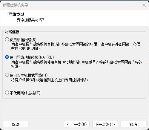 10. 选择虚拟机网络类型,我选的NAT,这样能隔离虚拟机和宿主机之间的网络,比较安全,设置后点击下一步: