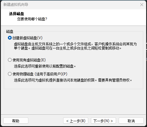 13.开始创建虚拟磁盘,相当于虚拟机的硬盘,一个分区一个虚拟磁盘,后续可以添加新的盘,如D盘、E盘,现在添加是C盘,我们是新建虚拟机,所以点击"创建新虚拟磁盘" ,如果你有老虚拟机磁盘需要添加进来,可以选择中间的"使用现有虚拟磁盘",虚拟磁盘的文件后缀名是.VMDK,比如WIN10.vmdk,选中后点击下一步: