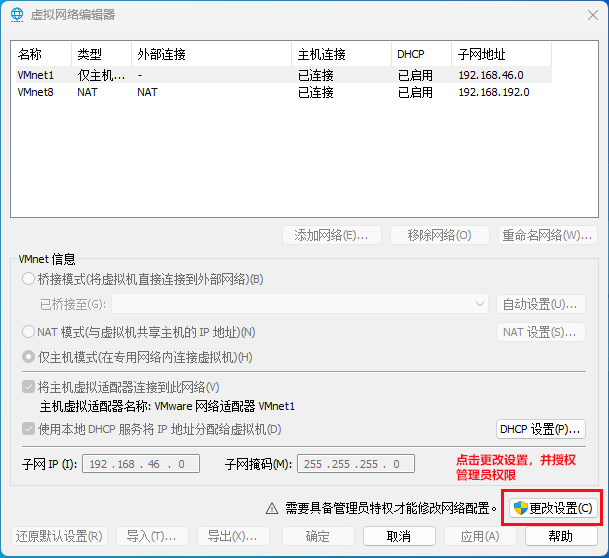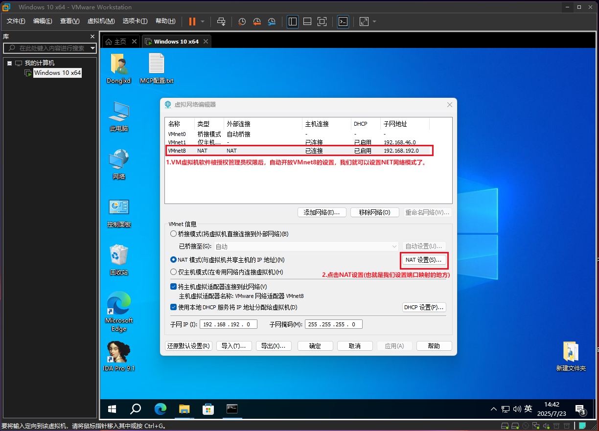 c.VM虚拟机软件被管理员授权后,自动开放VMnet8的设置,我们可以设置NET网络模式了。下一步点击"NAT设置"(也就是我们设置端口映射的地方)