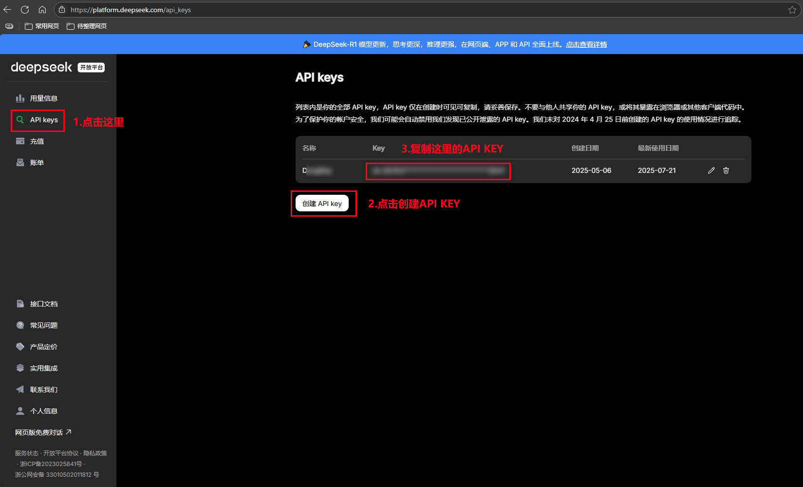 7.如下图,点击创建API KEY,并复制创建好的API KEY。