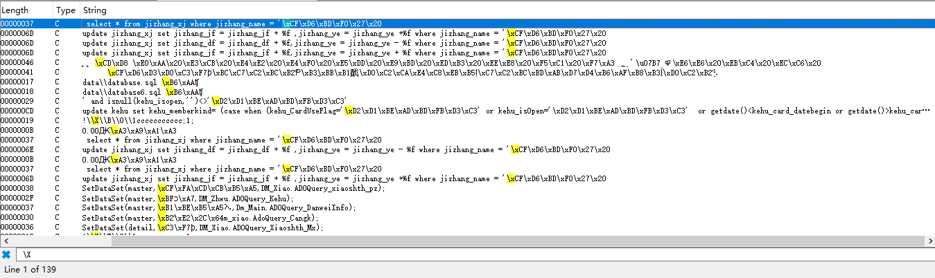 3. 打开Strings字符串窗口后,搜索下"X",可以发现有很多应该是中文的字符串没有显示出来,另外说一句,这个样本是一个仓储软件的主程序,所以有很多SQL的语句,供教程使用,大家使用后记得删除掉。忽略这些小问题,只看我的教程,我们随意点击下面搜索到的一个字符串。