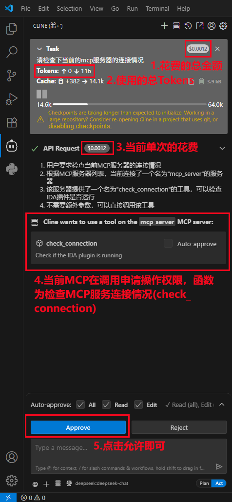 13.请看如下图的Cline使用说明,和Cline调用MCP服务函数时,需要授权的窗口提示,我们点击蓝色的Approve按键授权下,如果不想每次点击,可以点击蓝色按钮上面的Auto-approve把权限赋予Cline。
