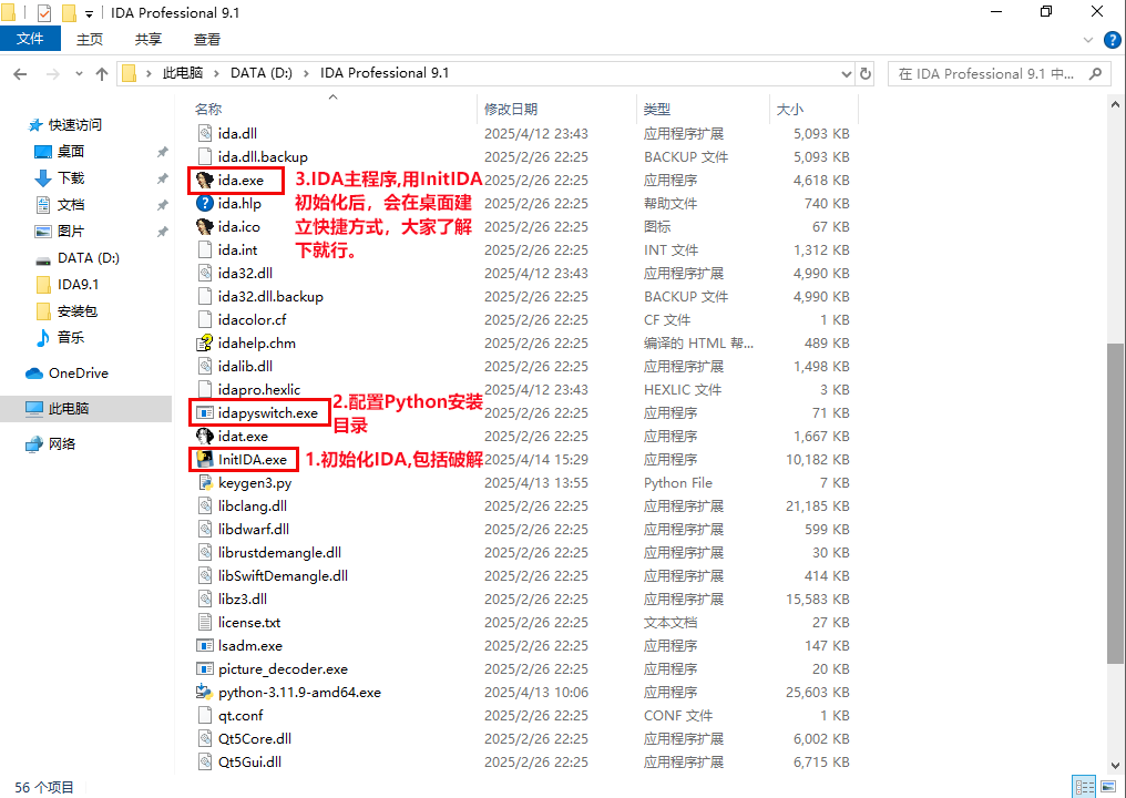 3.解压后,进入D盘的IDA Professional 9.1目录,找到InitIDA.exe运行下,它会自动初始化IDA9.1。