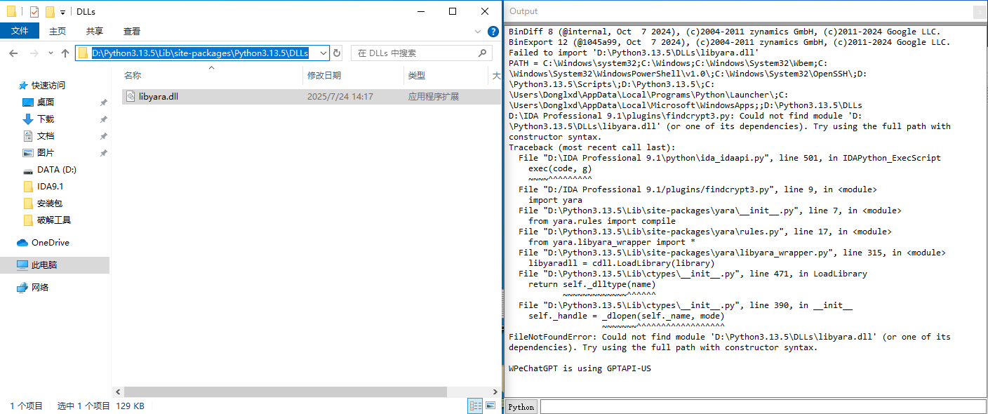 提示error:Could not find module 'D:Python3.13.5DLLslibyara.dll' (or noe of its Try using the full path with constructor syntax.)