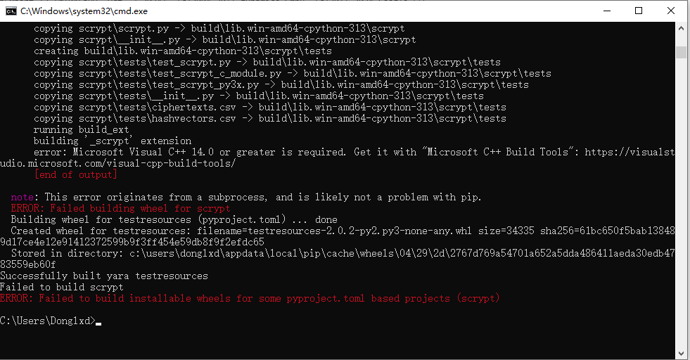 可以看到出现error: Mirocosft Visual C++ 14.0 or greater is required. Get it with "Microsoft C++ Build Tools": https://visualstudio.microsoft.com/visual-cpp-build-tools