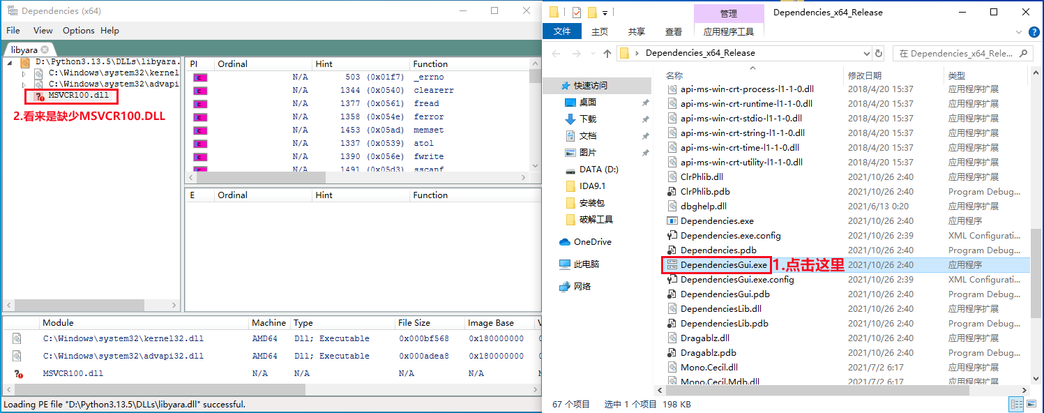 这个安装包我也提供了,在"IDA安装包"的第5项,安装很简单,不再截图,运行后重启IDA,显示成功,左边图中的ida输出没有报错信息,右边的Dependencies查询"libyara.dll"也没有错误,如下图: