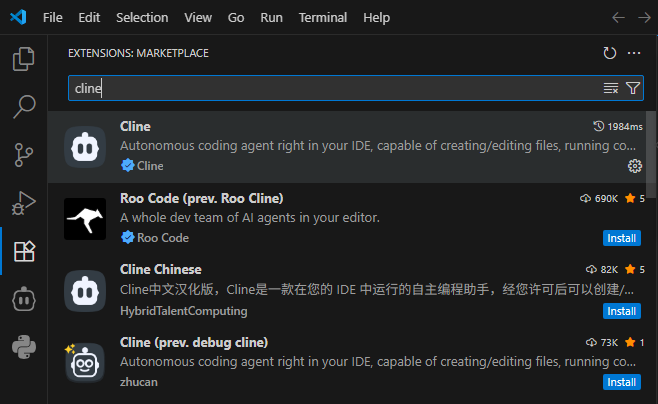 4.然后安装下Vscode编译器和Cline插件,这些都很简单,因为篇幅太长,这里就不做介绍了,不懂的朋友可以搜索下教程。
