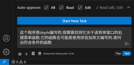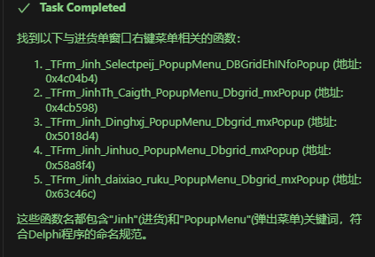14.因为我们使用的样本就是之前截图中的仓储软件的,所以我们尝试下,让deepseek分析所有函数中是否有和进货单窗口有关的右键菜单函数,稍后我们可以用x64dbg测试下是否正确。因为我们已经知道这个主程序是dephi编写的,所以直接告诉deepseek,以便它能更好的分析函数,当然你也可以让deepseek分析下程序是什么语言编写的,它一定可以给你答案。