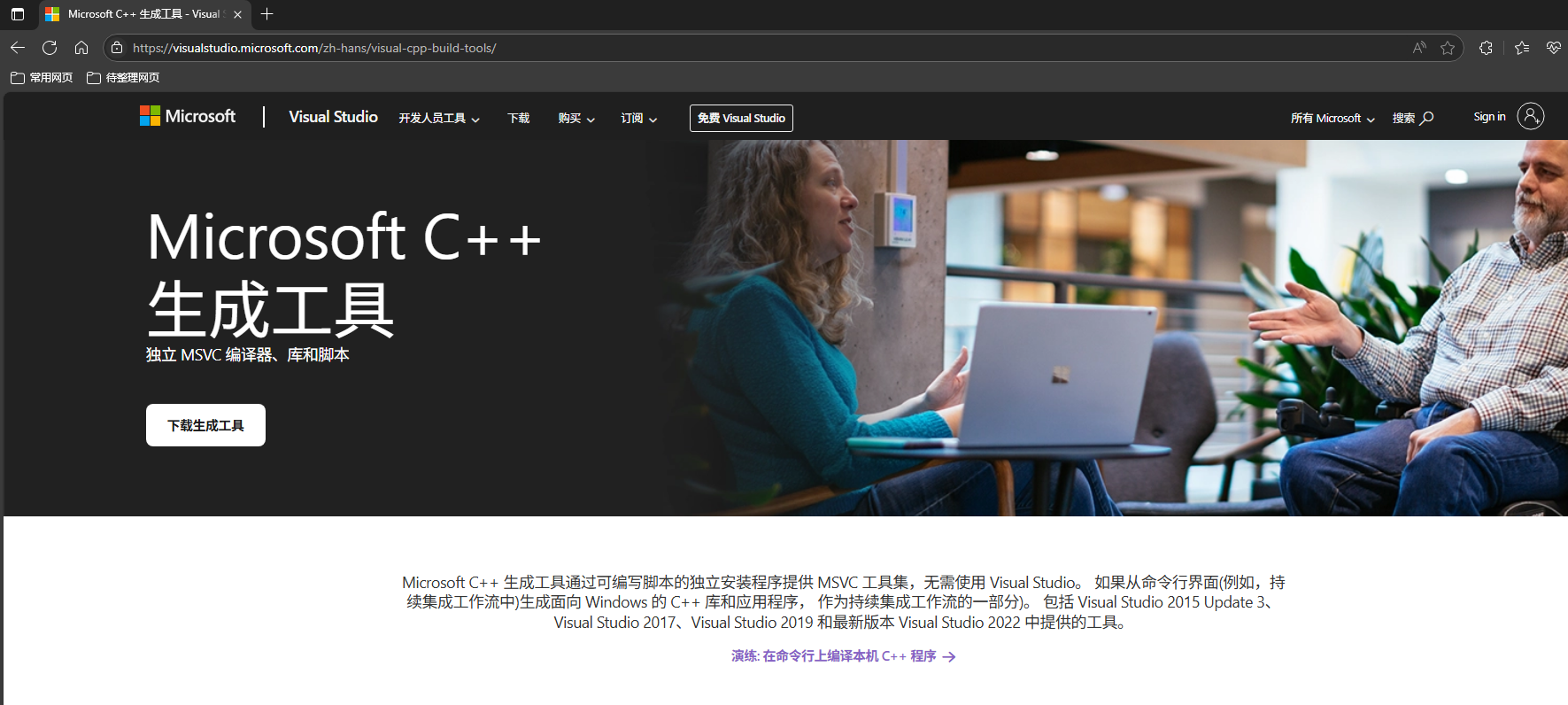 Error:Failed to build installable wheels for some pyproject.toml based projects(scrypt) 等多个错误,我们先到https://visualstudio.microsoft.com/visual-cpp-build-tools安装下C++编译工具,也就是VisualStudio,当前版本是VisualStudio2022,如下图页面: