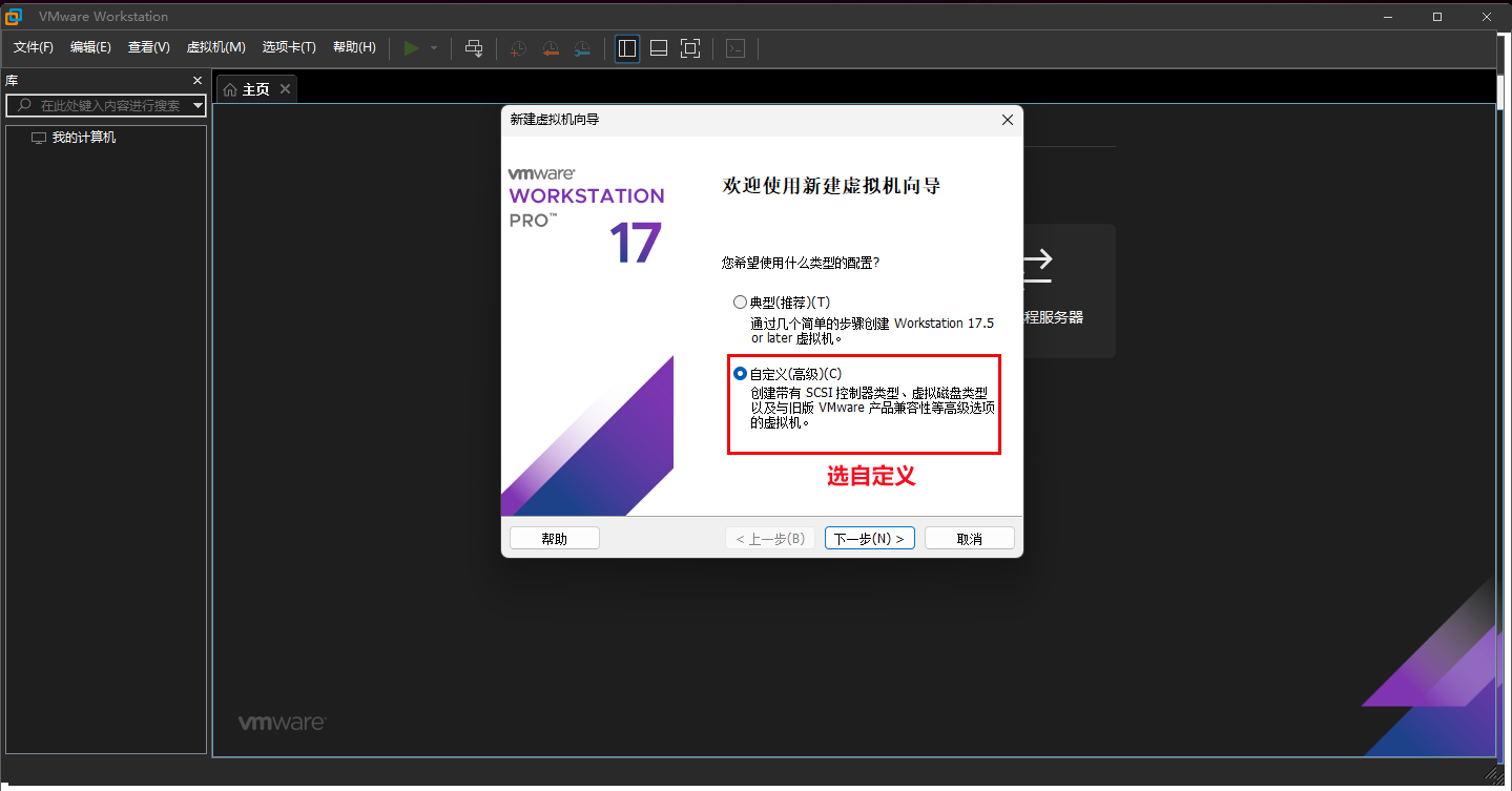 1.点击VM虚拟机上的"创建新的虚拟机",进入下面的界面,选择下面的自定义,点击下一步: