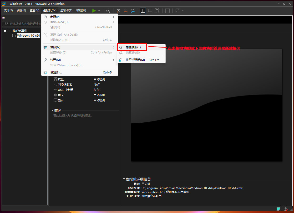 26. 关机后,点击"虚拟机"菜单-"快照"-"拍摄快照"或"快照管理器"