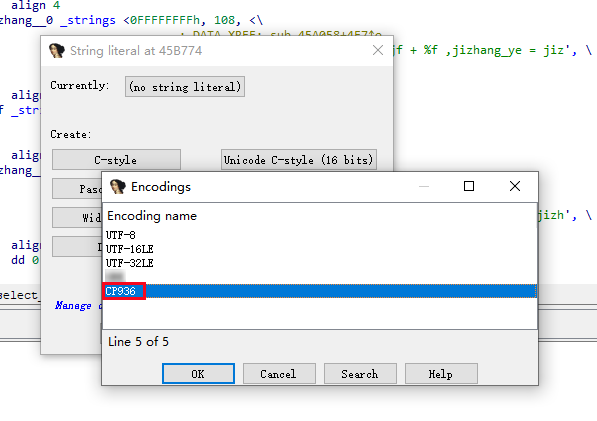 7. 然后在编码格式中输入"CP936",如果我们不知道输入什么编码格式,我们可以把ida里的字符串复制给Deekdeep、ChatGPT这类AI分析编码格式。