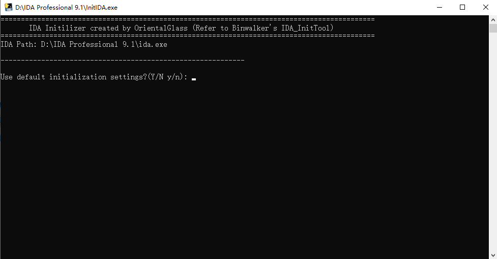 4.InitIDA.exe运行的界面如下,它应该是一个封装过的python程序,但是好像没有python环境也能运行,在选择处输出y,大小写都行,然后按回车,等待它执行完毕。
