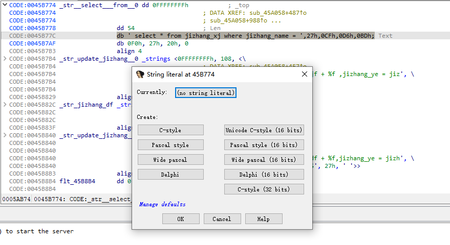 5.可以看到CODE:0045B77C有一个字符串,后半部分没有显示出中文。我们点击String literals窗口中的Currently后的(no string literal),显示"no string literal",说明这个分析文件,我们没有设置过全局的字符串编码格式。
