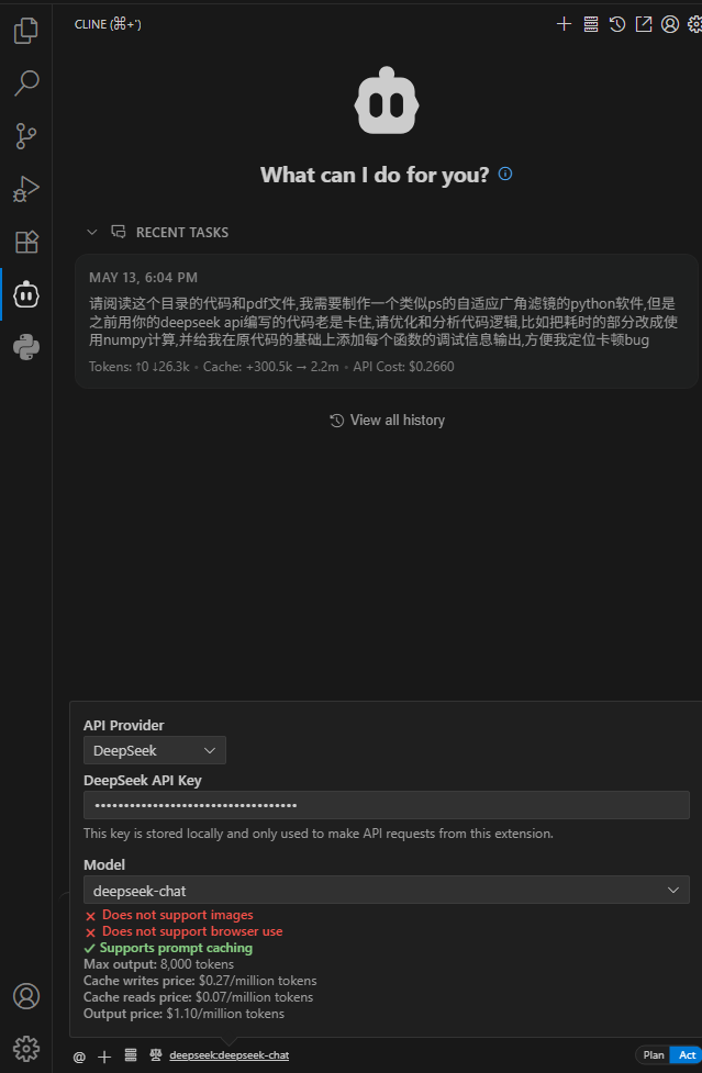 5.如下是安装好的Cline插件和需要设置的deepseek api key(因为我们需要AI来帮助我们通过MCP服务分析程序,所以需要一个API KEY,至于用什么AI,大家可以自行选择)