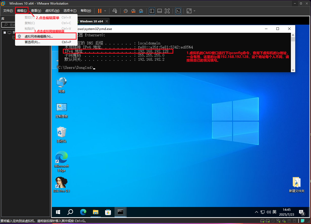 a.先用cmd查询下本机ip地址(图中IP地址:192.168.192.128),然后点击vm虚拟机的"编辑"菜单-"虚拟网络编辑器"