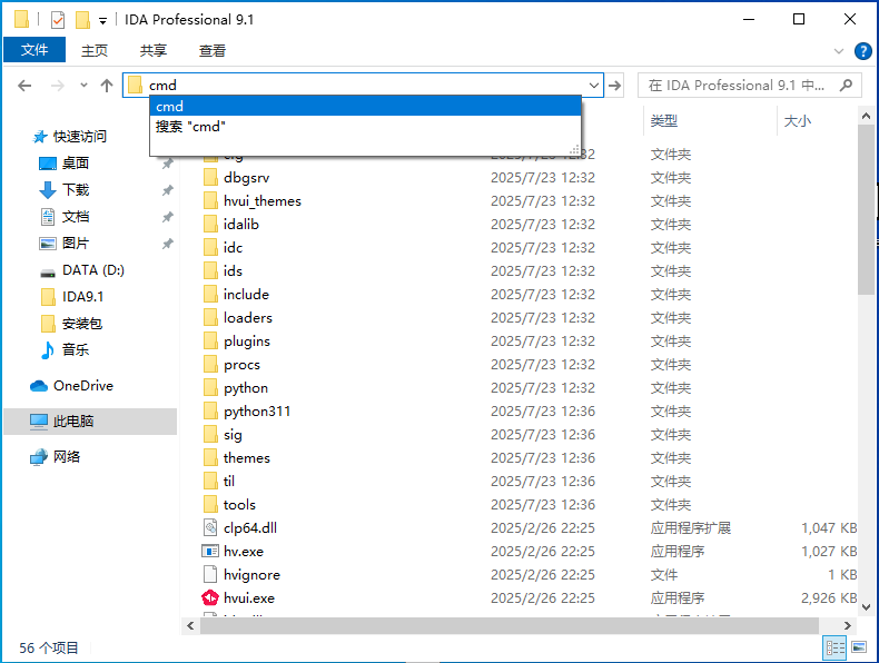5.然后在刚刚D:IDA Professional 9.1的地址栏中输入cmd,打开本地目录下的命令提示符: