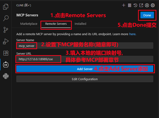 上面高亮标注的就是mcp服务器的配置信息,可以在虚拟机本地安装VScode和Cline,把上面的高亮内容复制到MCP服务的json配置文件中,就可以连接MCP服务器。