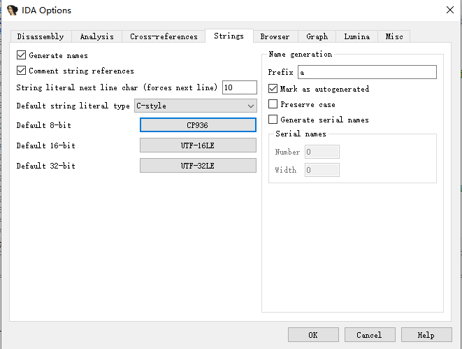 15.经过上面的操作后,如果还有个别短字符串没有识别出来,请按照我之前IDA8.1帖子的方法,设置下最小识别字符串长度( Minimal string length),我们一般设置成2就可以了,最后点击OK确定。