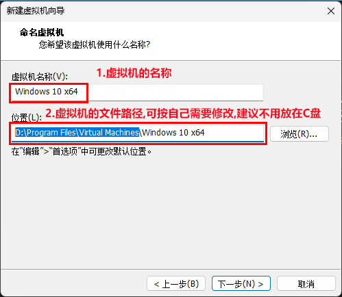 6. 此步可以修改虚拟机名称和保存路径,大家按需设置,建议保存路径不要设置在宿主机的C盘,最后点击下一步: