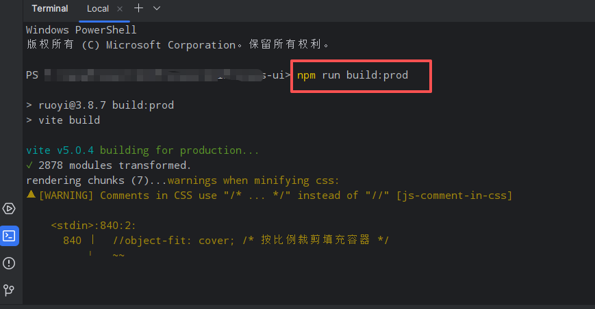 在前端终端中输入打包命令,这里打包的是生成版本。