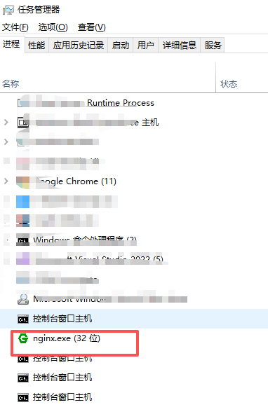 会有个黑影一闪而过,在任务管理器中可以看到nginx服务器已经运行。注意在已经运行的情况下,最好不要运行多个nginx服务器,可关掉多余的运行进程。