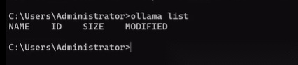比如可以输入一个Ollama list,就可以查看本地安装的所有大模型。因为现在我们还没有安装任何模型,所以这里是空的。