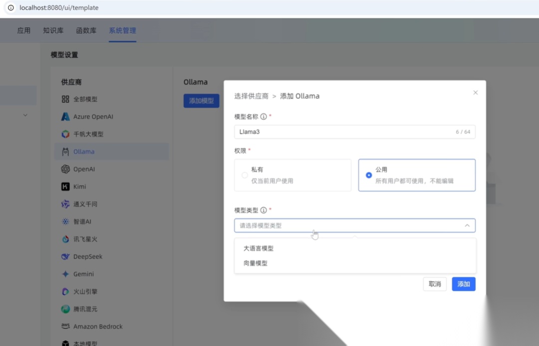 登录之后,在系统管理这里有个模型设置选项,在这里就可以配置我们想要使用的各种大模型。可以看到支持的模型有很多种,基本上目前市场上主流的大模型都是支持的。这里我们选择一个ollama之后,然后点击右侧添加模型按钮来添加一个新的模型文件名称。这里可以随便填一个,比如就叫做Llama3。权限这里可以根据自己的需求选择私有或者公开模型类型,可以选择大语言模型或者向量模型。