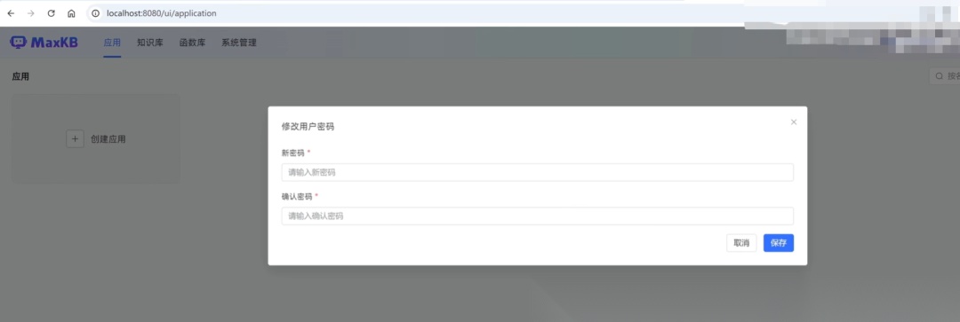 完成之后,就可以通过浏览器来访MaxKB的web界面了。打开浏览器之后,输入localhost:8080。然后输入默认的用户名和密码,用户名是admin,密码是:MaxKB@123…。第一次登陆的话,我会要求我们修改默认的密码,那么就来修改一下。