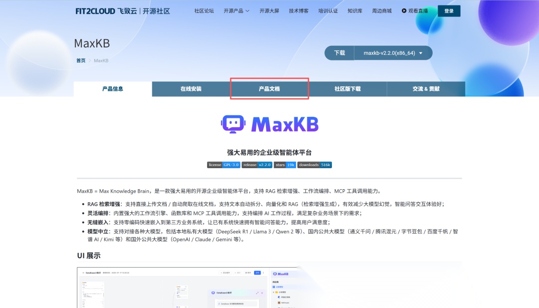 MaxKB就是这样一个基于大模型和Rag的系统,它的官方网址是http://maxkb.cn,打开之后,点击页面中间的下载安装按钮,就会来到它的官方文档页面。这里有非常详细的安装和使用说明。