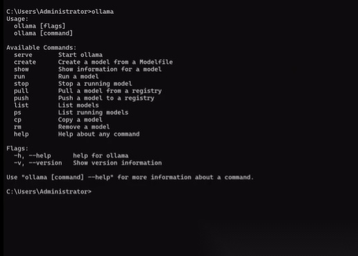接下来我们打开一个命令行终端,看一下Ollama如何来使用。Windows系统的话,可以直接在搜索框里面输入CMD或者power shell,回车之后就会打开一个命令行终端,然后在里面输入Ollama之后,回车就会看到Ollama命令的各种参数和用法。