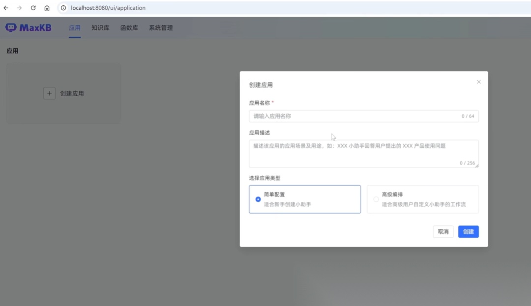 点击左侧的应用之后,再点击创建应用按钮,应用名称可以随便添一个,描述这里并不是必选的,可以不添。下面应用类型,这里选择简单配置就可以。