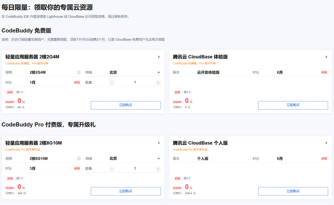 - 免费用户:送 1 个月 2 核 2G,如果能在 codebuddy 活跃 7 天,还赠送 2 个月,相当于 3 个月