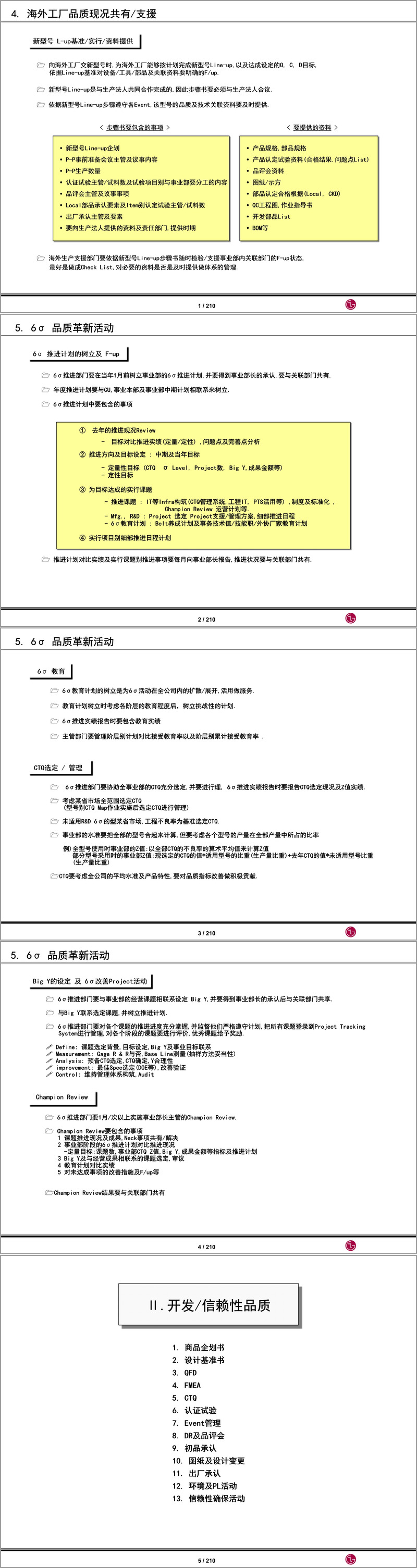本文件是 LG 品质体系运营的全面指导手册,适用于韩国事业部及海外工厂,旨在通过标准化、体系化的品质管理流程,实现品质持续提升。手册内容涵盖五大核心模块及附录,形成了从品质革新规划到具体执行、从开发设计到量产交付的全流程品质管控体系。