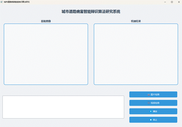 视频选择:为用户提供便捷的视频文件选择入口,通常可以通过点击对应的按钮(如 “选择视频” 按钮)弹出文件选择对话框,让用户能够从本地磁盘的指定文件夹中轻松定位到想要进行城市道路病害识别分析的视频文件。这个功能方便用户自主决定分析的素材来源,提高系统的灵活性与实用性。播放功能:通过专门设计的 “播放” 按钮,用户点击后能够启动视频的播放,按照正常的帧率顺序展示视频内容,便于实时观察视频中的城市道路病害情况。暂停功能:在视频播放过程中,“暂停” 按钮允许用户随时暂停视频画面,比如当看到感兴趣的城市道路病害画面或者需要仔细查看某一帧时,可及时暂停以便更好地观察细节。停止功能:“停止” 按钮则用于彻底结束视频播放,使视频回到初始未播放的状态,方便用户重新选择播放或者更换视频进行分析。预测结果显示:这是界面的核心输出部分,系统对视频中的城市道路病害进行识别并分析预测后,将相应的结果以清晰、易懂的方式展示在此区域。例如,可以结合一些可视化的图标或者标注框等在对应的视频帧画面上突出显示出城市道路病害所在位置及识别情况,方便用户直观地了解系统的识别成果。