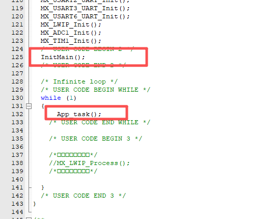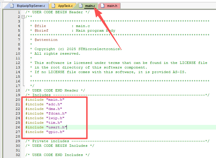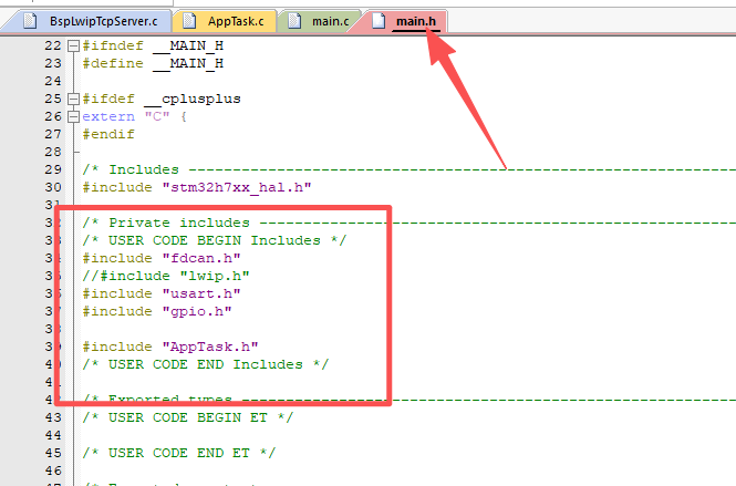 7.4、复制“main.c”所引用的头文件,粘贴到“main.h”文件的头文件引用出,注意“#include "lwip.h"”不要复制,用到的头文件复制,用不到的可以不用复制。再加一个头文件“#include "AppTask.h"”